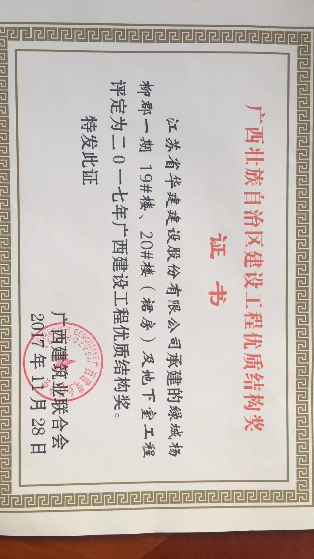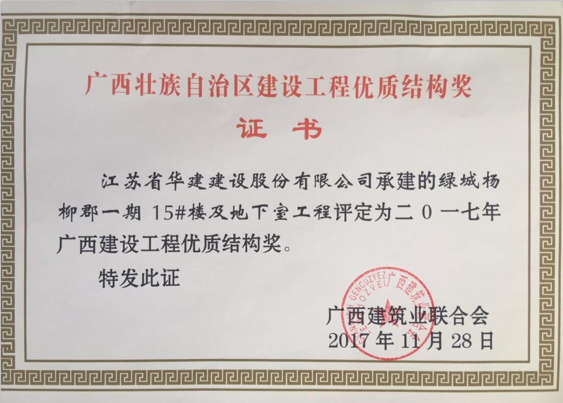 近期從廣西建筑業(yè)聯(lián)合會(huì)獲悉,我公司總承包施工的廣西自治區(qū)柳州市“綠城楊柳郡一期19#、20#樓(裙房)及地下室工程”和“綠城楊柳郡一期15#樓及地下室工程”兩項(xiàng)工程被評(píng)定為二0一七年廣西建設(shè)工程優(yōu)質(zhì)結(jié)構(gòu)獎(jiǎng),這也是北京區(qū)域公司在廣西自治區(qū)獲獎(jiǎng)的第一個(gè)項(xiàng)目。
