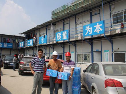 驕陽似火,熱浪滾滾,持續(xù)近一個(gè)月的高溫天氣給工程正常施工帶來了很大的影響,奮戰(zhàn)在烈日炎炎下的一線員工的身體狀況時(shí)刻牽動(dòng)著公司領(lǐng)導(dǎo)的心。7月29日,上海室外溫度更是超過40度,江蘇華建副總經(jīng)理、上海分公司總經(jīng)理?xiàng)罱芴氐匚锌偣こ處熚捍好鳌⒐?huì)副主席陳德權(quán)等同志赴由公司承建的上海楓葉國際學(xué)校工地看望一線作業(yè)人員,為員工送去了礦泉水、毛巾等清涼慰問品,并叮囑要注意避開高溫作業(yè)時(shí)段,保護(hù)身體,確保夏季施工生產(chǎn)安全。