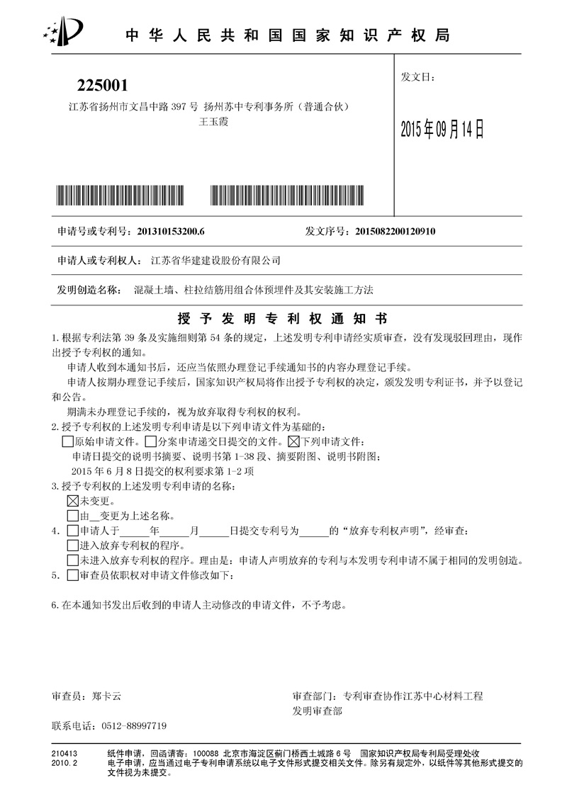 公司獲一項發明專利 時間:2015-09-15 5971 日前,江蘇華建上海區域公司發布的《混凝土墻、柱拉結筋用組合體預埋件及其安裝施工方法》發明創造被國家知識產權局授予“發明專利權”,專利號:201310153200.6。