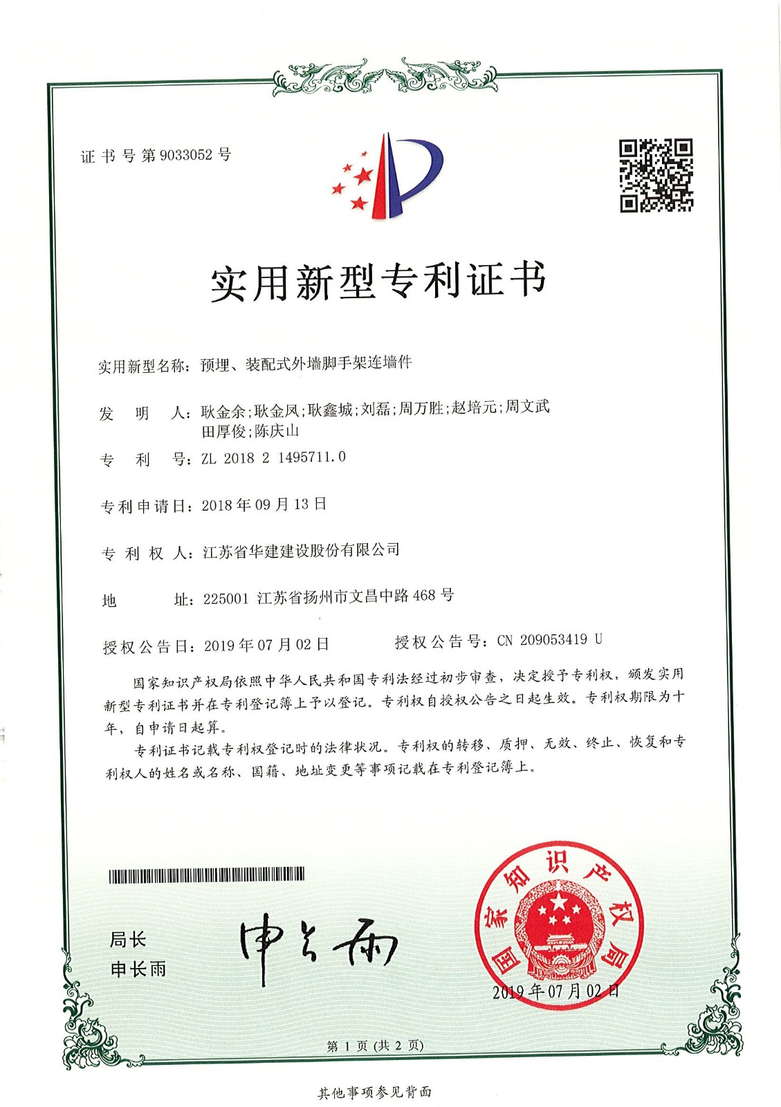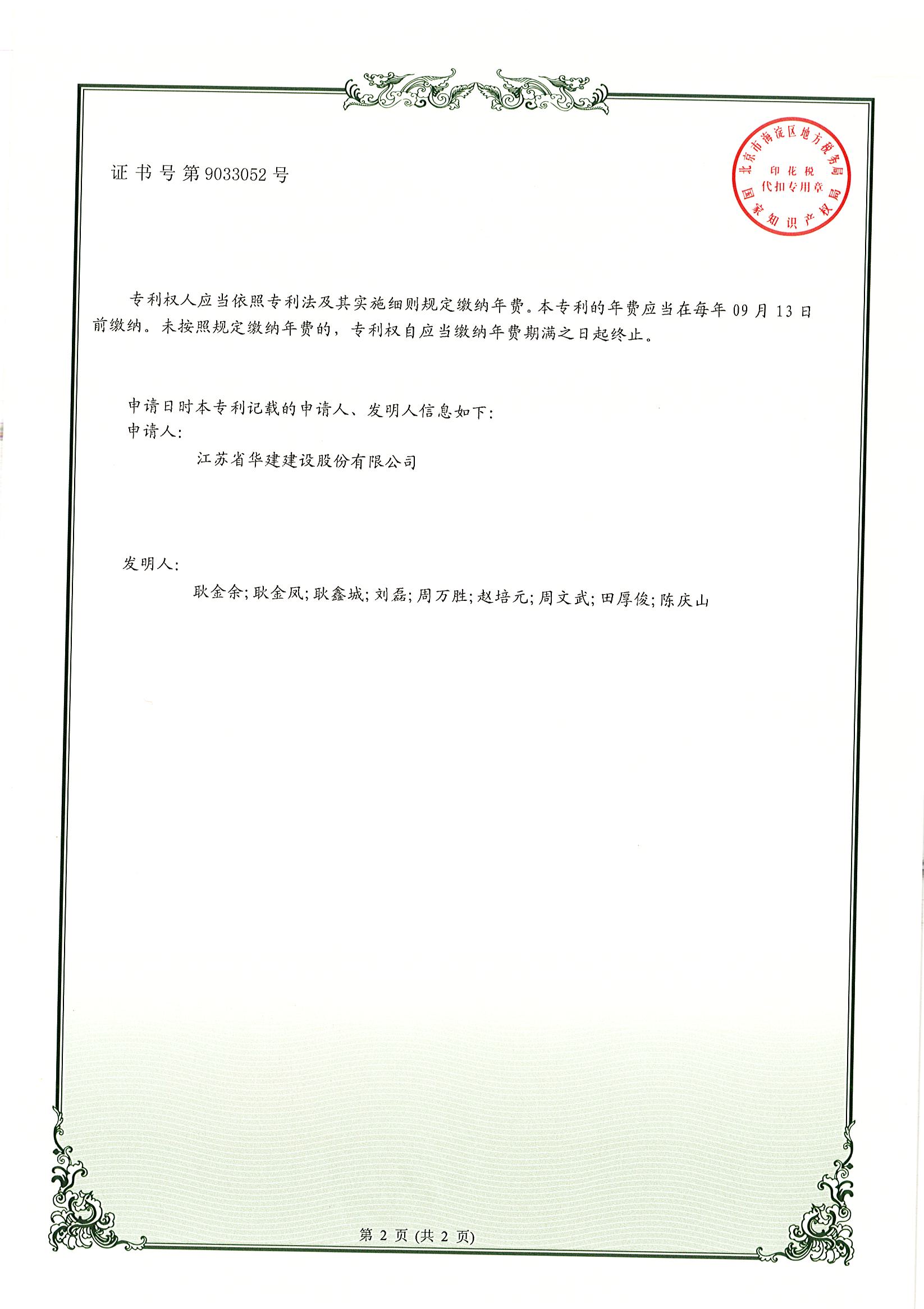 實(shí)用新型專利證書(工具、組合式鋼質(zhì)定型安全圍墻)