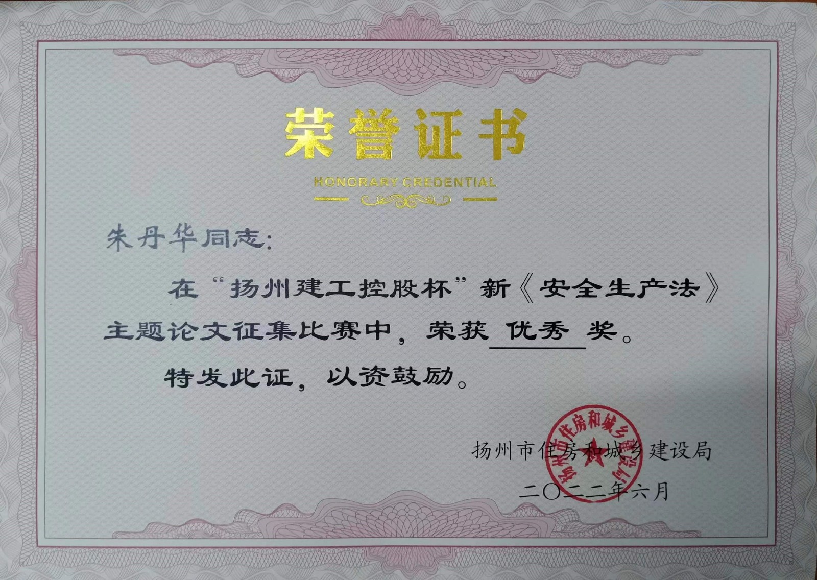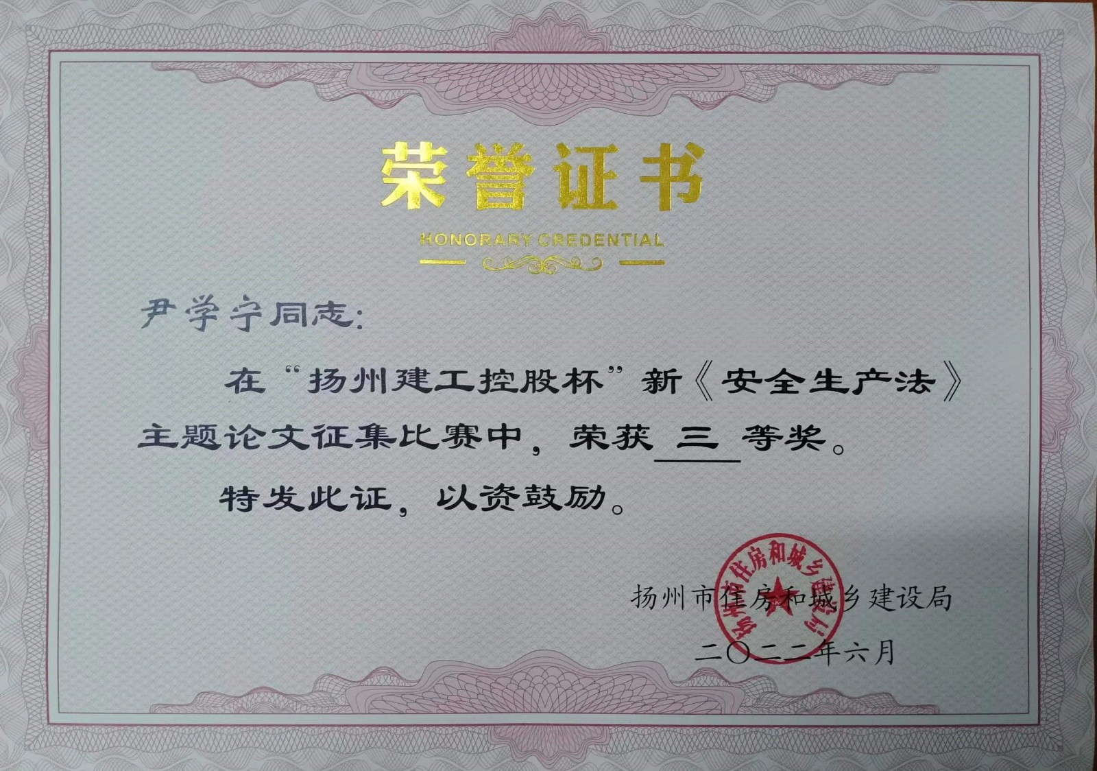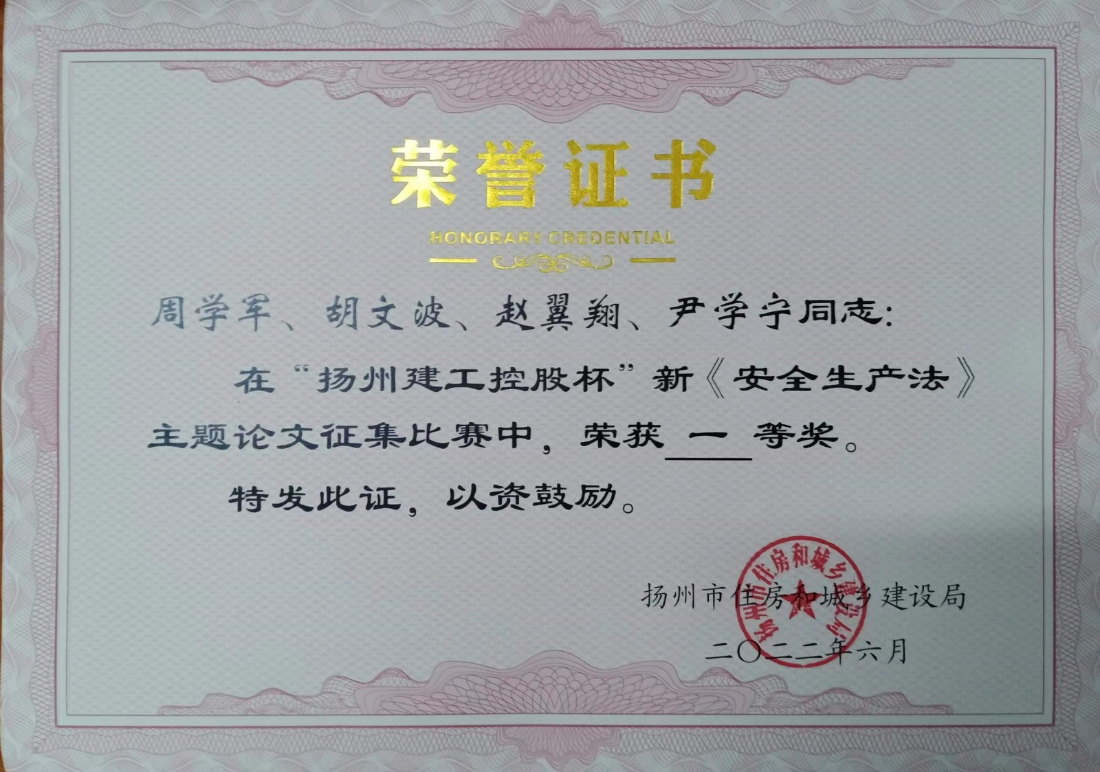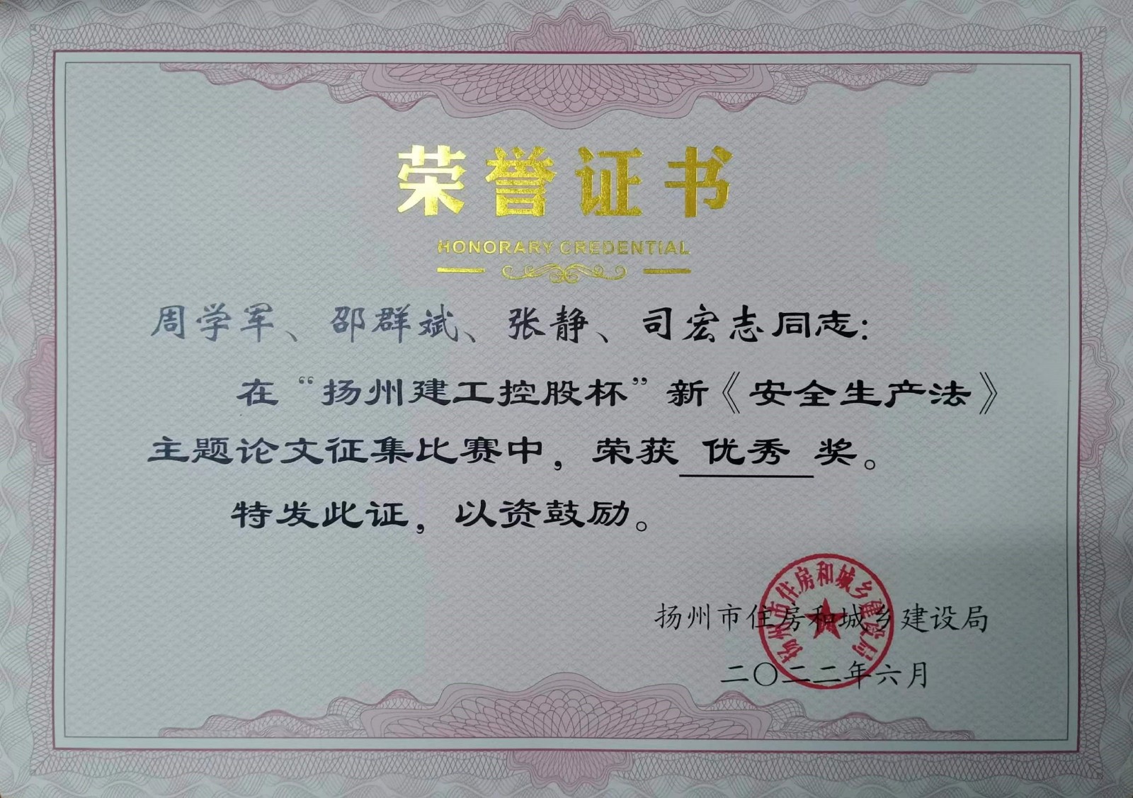 北京分公司4篇論文獲揚州市新《安全生產法》主題論文征文比賽獎項 時間:2022-07-16 4207 近日,從揚州市住房和城鄉建設局傳來喜訊,由北京公司投稿的4篇論文榮獲“揚州建工控股杯”新《安全生產法》主題論文征文比賽獎項,并獲頒證書,其中一等獎一項,三等獎一項,優秀論文獎兩項。