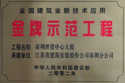 工程施工過程中,江蘇華建科學決策、精心組織,有效地解決了6-49層斜向鋼骨柱測量控制、鋼骨安裝與鋼筋砼交叉施工、厚鋼板超重復雜構件制作和安裝精度與變形控制、超重大型鋼構件吊裝、設備管線交錯復雜、屋頂高空大懸挑網架安裝、單元式幕墻安裝及預埋件精度控制、50厚花崗巖干掛等諸多施工難題,應用了土釘墻和預應力錨桿深基坑支護、C50、C55、C60高強砼、冷軋帶肋鋼筋焊接網、電渣壓力焊、錐螺紋和冷擠壓套筒接頭、電梯井筒爬模、懸挑斜拉腳手架、陶粒混凝土砌塊、新型防水涂膜和卷材、PVC塑料管、計算機管理以及內爬式塔吊、大體積混凝土電腦自動測溫、卡箍式離心鑄鐵排水管、球墨鑄鐵給水管等新技術。2000年8月該工程經建設部驗收認定“新技術應用水平達到國內領先水平”,被授予“全國建筑業新技術應用金牌示范工程”稱號。施工期間,該工程還榮獲建設部“建筑安全獎”。