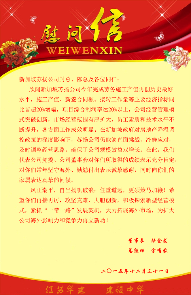公司董事長(zhǎng)、總經(jīng)理發(fā)慰問(wèn)信勉勵(lì)新加坡蘇揚(yáng)公司再接再厲再立新功