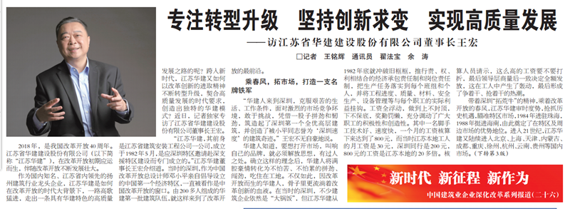 王宏董事長接受《建筑時報》專訪:專注轉型升級,堅持創新求變,實現高質量發展 時間:2018-09-11 4216 9月10日,《建筑時報》頭版及微信公眾號對王宏董事長的專訪給予了刊載。 王宏董事長在專訪中就江蘇華建成立36年來,是如何在改革開放的時代大背景下,走出一條具有華建特色的高質量發展之路,跨入新時代,江蘇華建又是如何以改革創新的進取精神不斷轉型升級,契合高質量發展的時代要求,創造出獨特的華建模式進行了詳細介紹。
