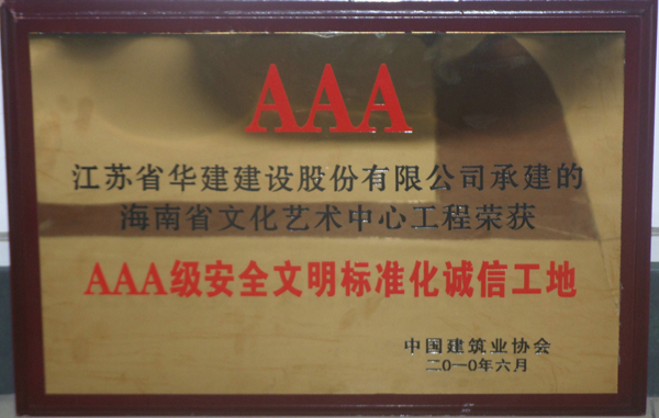 “海南省文化藝術中心”項目榮膺全國AAA級安全文明標準化誠信工地 時間:2010-07-24 5337 近日,經中國建筑業協會建筑安全分會在專家評審、組織抽查和網上公示,海南公司承建的海南省文化藝術中心工程榮膺全國“AAA級安全文明標準化誠信工地”,這是海南公司近年來首次獲得此項榮譽。 該項目自開工以來,以摘取魯班獎為最高質量目標,積極策劃,精心組織,以過程創精品,狠抓細部施工,各項指標始終處于受控狀態,多次接受省、市領導、專家、同行的現場觀摩,獲得業內高度評價。