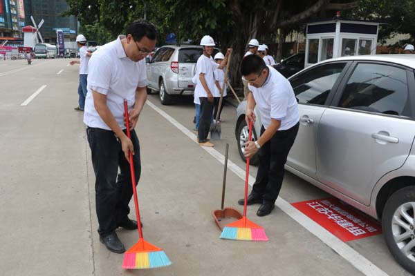 江蘇華建積極響應海口市“雙創”活動 時間:2015-09-01 2939 8月29日上午,海口市龍華區“雙創”啟動大會在我公司承建的恒大外灘中心項目現場召開,龍華區區委書記王東等領導出席啟動儀式,公司副總、海南分公司總經理王宏到會并做表態發言。 隨后,會場舉辦“我愛海口,力爭雙創”授旗儀式,并組織志愿者“自掃門前雪”,手拿掃把、簸箕等工具,將所屬衛生轄區打掃得干干凈凈,以實際行動來踐行“雙創”工作。