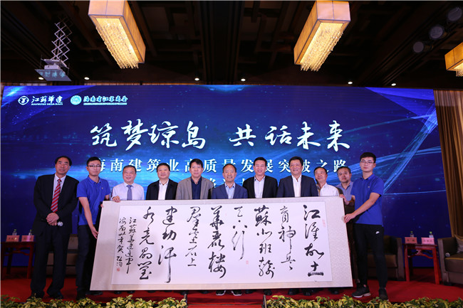 論壇上,原海南省委常委、宣傳部長、國家行政學院原副院長周文彰欣然為江蘇華建進瓊三十周年賦詩題字:“江淮沃土育神兵,蘇北班輸天下行。華麗樓群基石上,建功汗水亮晶瑩”。