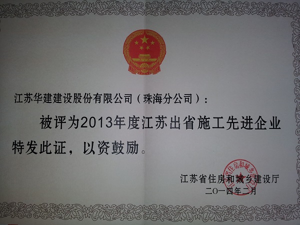 珠海公司獲江蘇省政府駐深圳辦事處和江蘇省住建廳聯合表彰 時間:2014-04-29 4866 日前,江蘇省人民政府駐深圳(廣州)辦事處和江蘇省住房和城鄉建設廳聯合表彰了一批2013年度江蘇進廣東、廣西、福建、海南施工先進企業和先進個人。江蘇華建珠海分公司被表彰為2013年度江蘇出省施工先進企業,珠海公司副總經理周學軍被表彰為2013年度江蘇出省施工優秀企業經理,曹亞明同志被表彰為優秀建造師。 此外,珠海公司副總經理盧達被江蘇省住房和城鄉建設廳駐南方辦事處表彰為2013年度江蘇省進廣東施工質量安全管理先進個人,李成祥同志被表彰為經營財務管理先進個人。