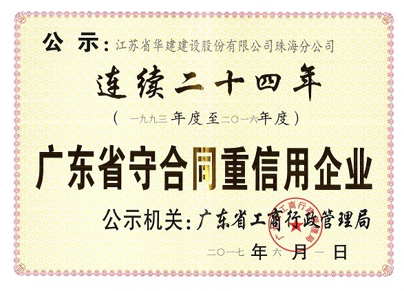 公司連續(xù)二十四年被廣東省工商行政管理局表彰為“守合同重信用企業(yè)” 時間:2017-07-03 4297 近日,珠海公司被廣東省工商行政管理局授予“連續(xù)二十四年守合同重信用企業(yè)”榮譽稱號。