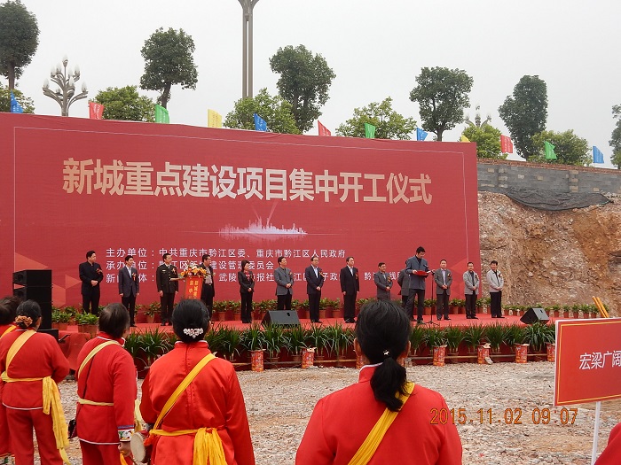 11月2日上午9:00,重慶黔江新城重點建設項目集中開工儀式在我公司承建的黔江區學府花苑項目現場隆重舉行。黔江區委書記余長明、區長徐江、人大主任梁正華、政協主席秦代書率四套班子成員和項目業主、施工方、監理方代表等共同出席儀式并為項目培土奠基。