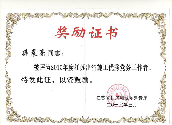 近日,重慶分公司被江蘇省住房和城鄉建設廳表彰為“2015年度江蘇出省施工先進企業”,重慶分公司總經理嚴正濤榮獲“2015年度江蘇出省施工優秀企業經理”稱號,樊晨亮被評為“2015年度出省施工優秀黨務工作者”。