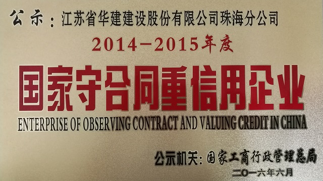 公司榮獲國家級“守合同重信用”企業稱號 時間:2016-08-02 3039 日前,國家工商行政管理總局向社會公示2014-2015年度“守合同重信用”企業名單,珠海公司榮獲國家級“守合同重信用”企業稱號。 珠海市共計13家企業被國家工商總局表彰為2014-2015年度“守合同重信用”企業,其中新上榜企業4家。榮獲該稱號充分展現出江蘇華建在珠海市場守法履約的良好施工企業形象。
