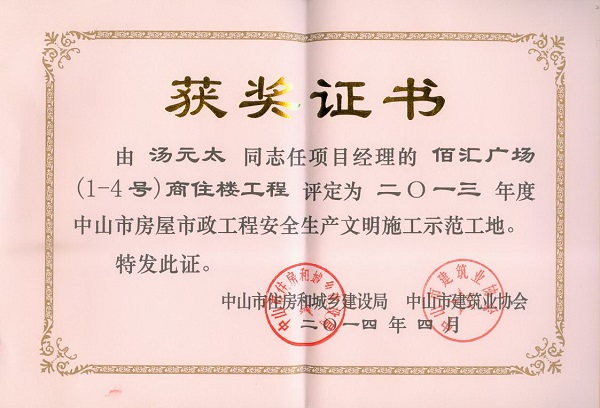 2013年度佰匯廣場商住樓工程中山市房屋市政工程安全生產文明施工示范工地