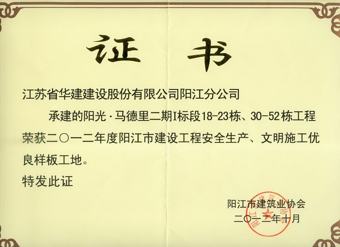 2012年陽光馬德里二期陽江市建設工程安全生產、文明施工優良樣板工地