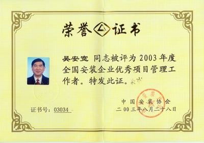 2002年開始他被聘為北京市建設工程評標專家;2003年獲“中國安裝企業優秀項目管理工作者”稱號,2004年獲全國工程建設“優秀項目經理”稱號;2006年獲全國安裝企業優秀項目經理; 2007年獲揚州市國資委黨委頒發的“三強”黨支部書記稱號;2008年12月獲得中共北京市外地在京施工企業委員會頒發的在奧運工程建設中的優秀共產黨員;2009年獲“江蘇省建筑業企業杰出建造師”和中國建筑業協會頒發的“全國建筑業企業優秀項目經理”榮譽稱號。2009年他還參加了英國皇家特許建造師(CIOB)國際執業資格認證培訓。目前,他已順利通過考試,獲得英國皇家“英國特許建造師”資格。
